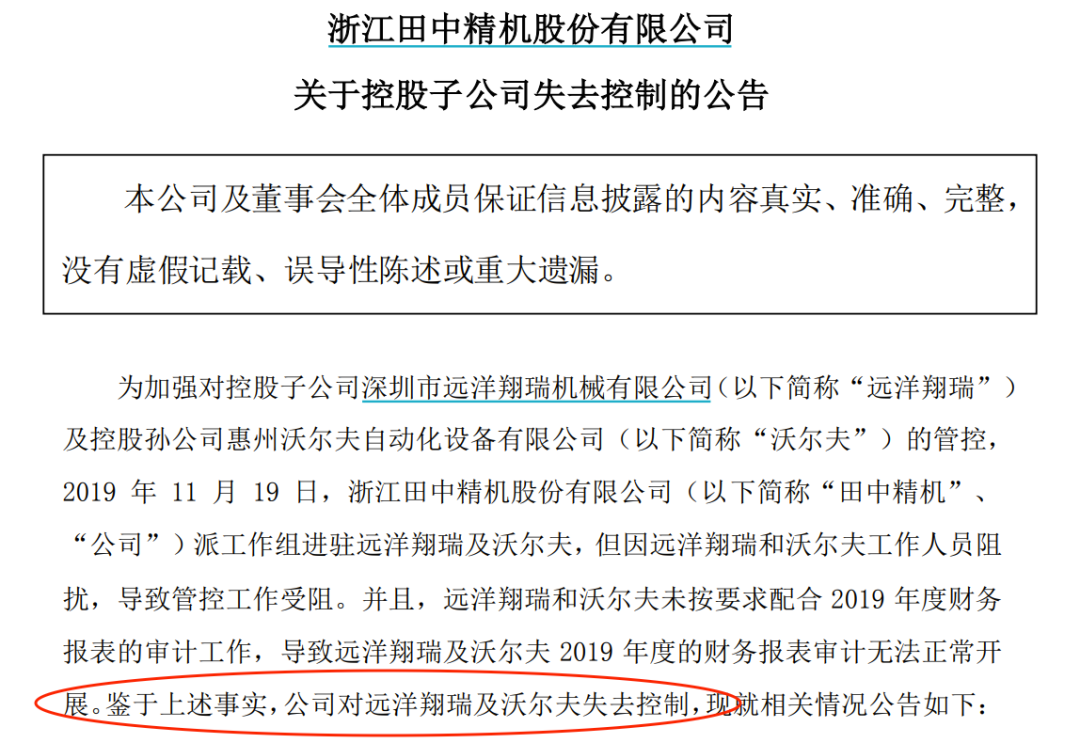 3月24日,田中精机总经理张玉龙和财务总监陈弢亲赴沃尔夫厂区,结果被保安拒绝放行进入,沃尔夫相关负责人员也拒不接听电话。在此背景下,田中精机不得不公告,“已在事实上失去对远洋翔瑞及其子公司沃尔夫的控制”。