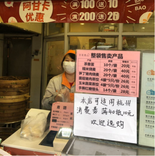 据都市快报报道,3月29日,杭州城西一家早餐店打出了“本店可适用杭州消费券,满40抵10元”的招牌,平日论个买的烧麦和茶叶蛋,很多人一打一打地买。