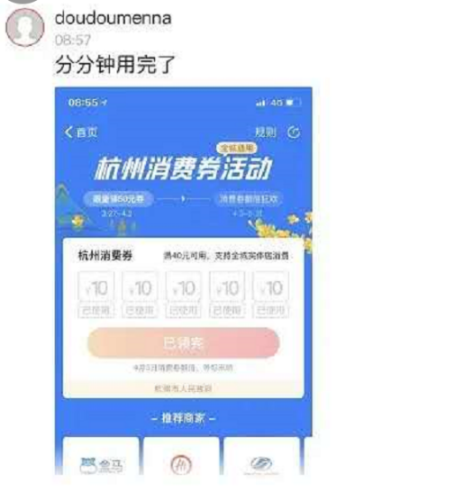 据悉,杭州的消费券消费场景几乎全覆盖,只要是商家都可以消费抵扣不管是街边吃早餐,小店购物,还是医院看病拔牙,或者房租交租、停车费和加油这样的“刚需”都可抵扣。一位杭州的消费者说,消费券一下放,很快拿去消费了,分分钟都用完了。