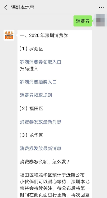 据基金君了解,在深圳本地生活服务号“深圳本地宝”的对话框中输入“消费券”即可找到罗湖区消费券申领入口。