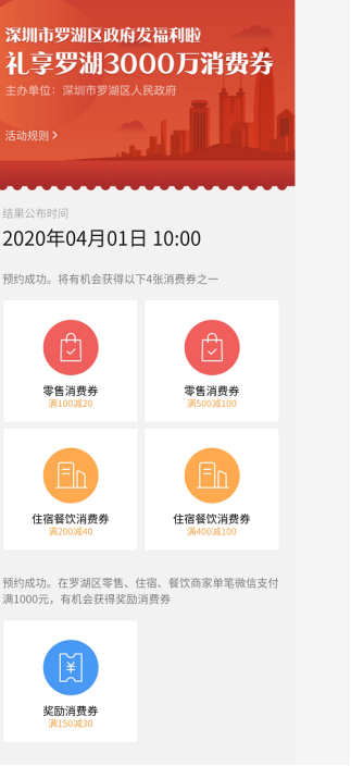 3月31日,深圳罗湖区宣布,将从4月1日起向消费者发放3000万元消费券,微信扫码即可预约申领;此前深圳福田、龙华也宣布消费券措施,后续也将公布具体发放政策。