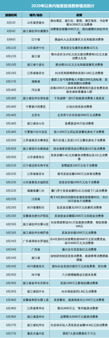 3月30日,浙江嘉兴宣布发放总规模超2亿元消费券,共分为通用券、餐饮券、旅游住宿券、商超零售券、体育健身券、图书券、通讯消费券、汽车券8种类型,将通过微信平台和支付宝平台分6轮投放,单张消费券最高额达5000元。