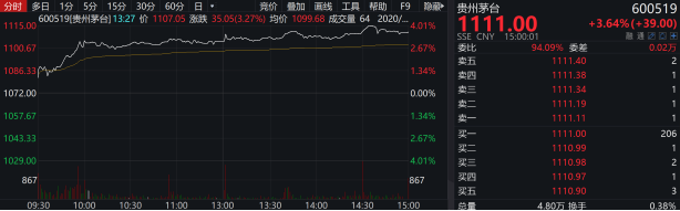 其中,日常消费指数涨超4%以上,板块内近20只个股涨停,198只个股上涨。股王茅台重回1111元,市值接近1.4万亿。