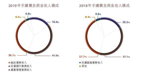 具体来看,中金公司2019年年手续费及佣金构成中,投行业务仍是担纲项目,当期实现43.96亿元收入,占比41.0%;经纪业务收入以38.78亿元紧随其后,占比36.1%;资管业务收入20.01亿元,占比18.6%;投资咨询业务4.25亿元,占比4%。