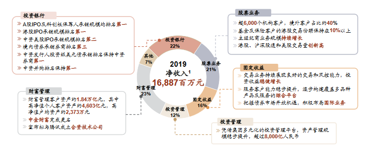 透视中金公司年报信息,其“双基六柱”的提法成为2019年的新亮点:“双基”是指研究和信息技术,“六柱”则是指投资银行、股票业务、固定收益、私募股权、资产管理、财富管理六大板块。