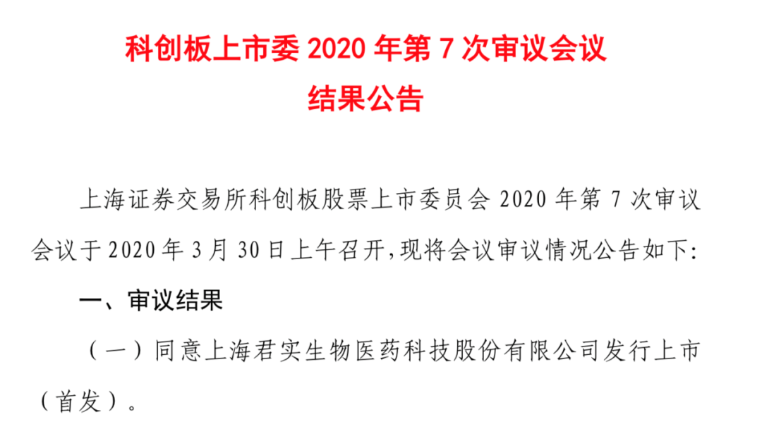 3月30日科创板上市委发布2020年第7次审议会议结果公告,同意上海君实生物医药科技股份有限公司发行上市。
