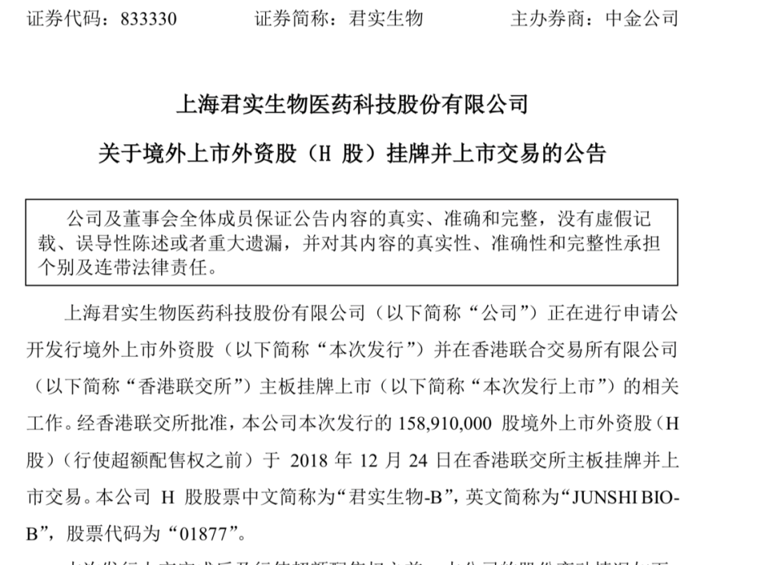 随后君实生物在2018年12月上市,彼时为内地首个“新三板+H股”的企业。发行价为19.38港元/股,募集资金为29.44亿港元。