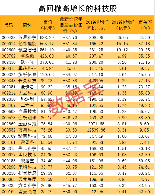 证券时报·数据宝从电子、计算机、通信、传媒四大科技板块中,筛选出满足最新收盘价较年后最高价回撤幅度超过30%、2019年归属于母公司净利润超三千万、2019年净利润增速超过100%、滚动市盈率低于100倍等四个条件的非ST股,26股浮出水面。