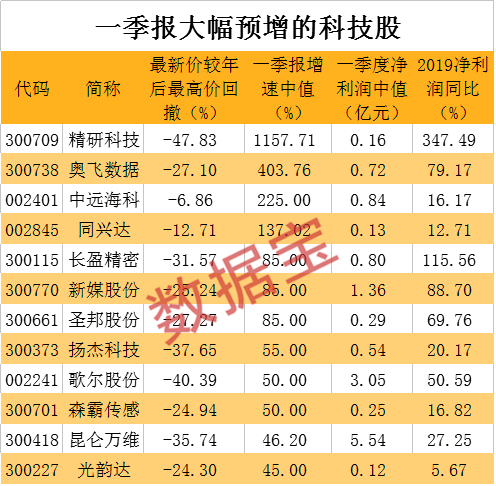 数据宝统计,在2019年净利润同增的科技股中,12股预告2020年一季度净利润中值超千万且净利润增速中值超40%。
