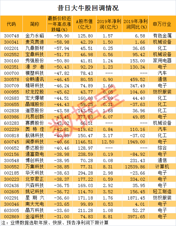 不过从最新情况来看,上述大牛股整体回调较为明显。数据显示,30股最新收盘价较近一年高点回调30%以上,其中金力永磁、麦克奥迪、九鼎新材、宝鼎科技、秀强股份、漫步者等回调幅度超过50%。回调幅度最大的是金力永磁,该股曾是稀土永磁概念龙头,去年8月30日盘中创下历史高点,如今股价已回落59.9%。