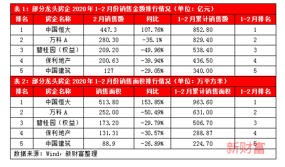 2020年2月销售金额达百亿元量级的房企,仅有6家。其中,恒大地产以2020年2月实现销售金额447.3亿元、同比增速为107.76%,排名行业之冠,成为TOP阵营中唯一实现正增长的房企,将万科、碧桂园、保利地产、中国建筑(601668)甩在身后,堪称一枝独秀。相比之下,TOP30房企中,销售降幅最大的5家房企,下滑幅度均超过了60%以上。