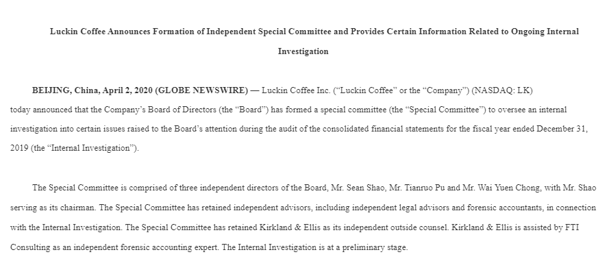 特别委员会由三名独立董事Mr. Sean Shao、Mr.Tianruo Pu、Mr. Wai Yuen Chong组成,由Mr. Sean Shao担任主席,Mr. Tianruo Pu 和 Mr. Wai Yuen Chong则是3月27日瑞幸咖啡刚刚任命的独立董事。特别委员会已就内部调查保留了独立法律顾问和法务会计师,Kirkland&Ellis将在FTI Consulting的协助下担任独立的法务会计专家。