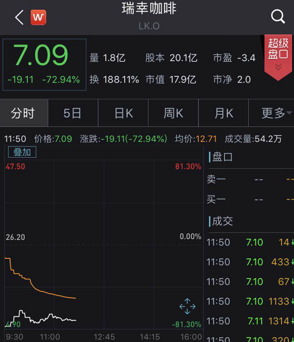 截至北京时间23:50,瑞幸咖啡盘中第六度暂停交易,目前跌72.94%,股价报7.09美元,市值蒸发约48亿美元(约人民币340.5亿元)。