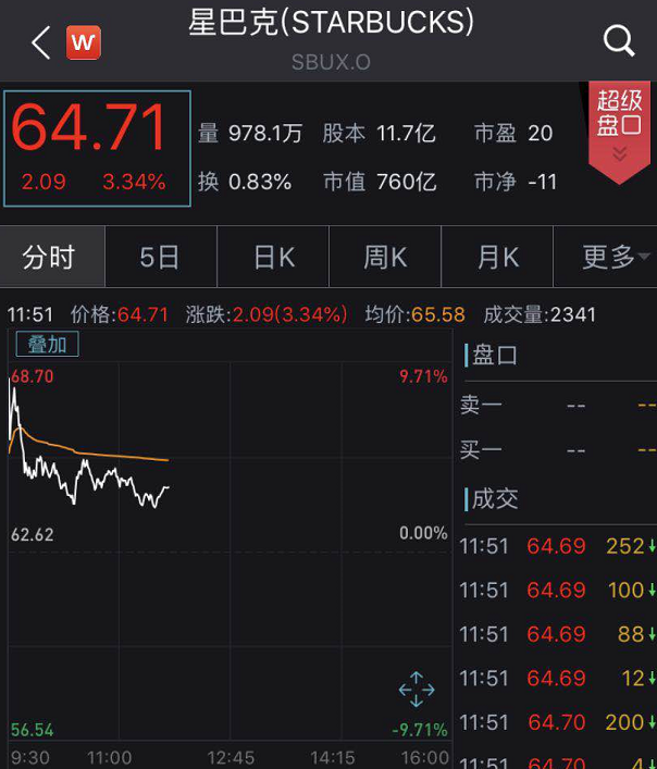 值得一提的是,星巴克盘中大涨近10%,随后涨幅回落,截至北京时间11点50分,股价报64.71美元,涨3.34%。