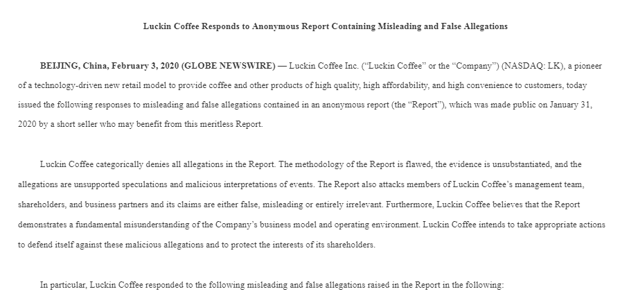 然而瑞幸咖啡却在2月3日发布公告,称该报告包含误导性和虚假信息,坚决否认报告中的所有指控。瑞幸咖啡还认为,这一报告恶意攻击了其管理团队、股东和业务合作伙伴,对公司业务模式和运营环境存在根本误解。