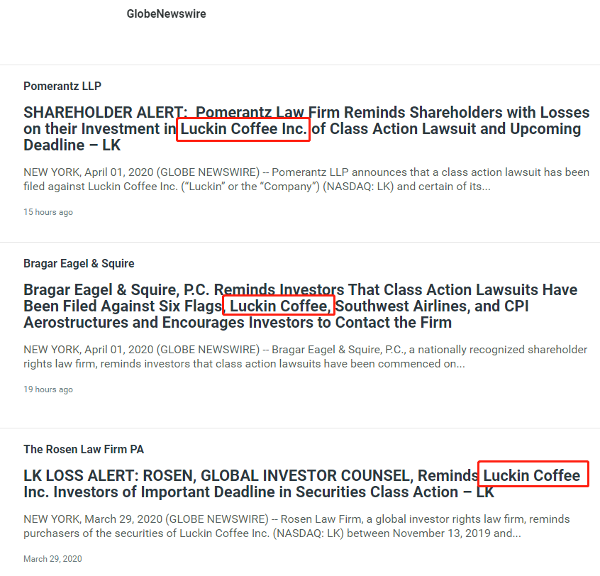 The Rosen Law Firm PA等在内,多家美国法律事务所均表示,在2019年11月13日至2020年1月31日间购买过瑞幸咖啡股票的投资者如果试图追回损失,应当在4月13日之前完成诉讼提交。