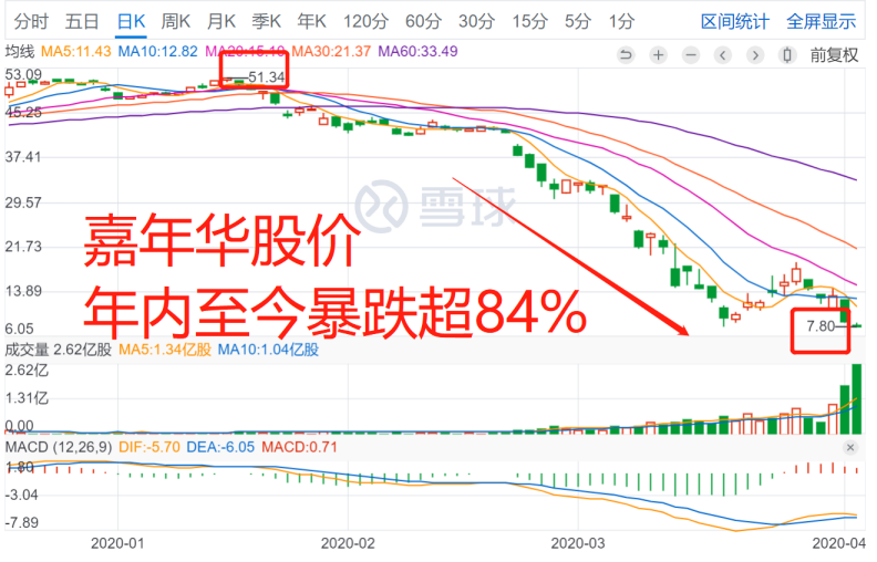 数据显示,从今年1月至今,嘉年华邮轮股价从高位43.54美元一路下跌至最低7.80美元,期间暴跌超84%,市值蒸发超228亿美元(约1600多亿人民币)。