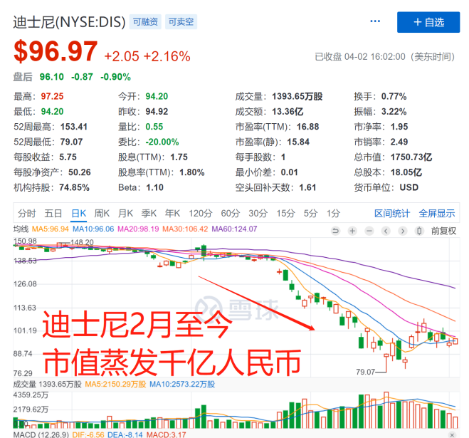 数据显示,年内至今,迪士尼股价直线下滑,跌幅超30%,最新股价为96.97美元,最新市值已跌至1750亿美元,今年市值已经蒸发超850亿美元(超6000亿人民币)。