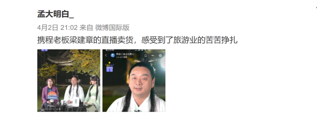 直播镜头面前,梁建章本人困倦的眼袋,仿古的长发,特意描画的眉毛成为了网友关注的焦点。梁建章扮装上阵,也让网友感受到了心酸,称“旅游业太难,大佬太拼。”