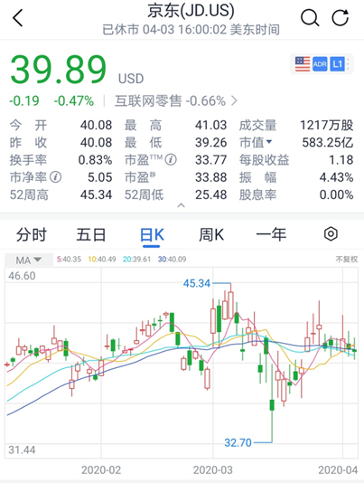 此外,在二级市场上,受财报等多重利好消息提振,京东股价从开年以来便一路上扬,哪怕疫情在全球爆发,美股市场爆雷不断也并未受到太大影响。截至美股4月3日收盘,京东报39.89美元/股,总市值583.2美元,折合人民币4135亿。不仅与最新市值429亿美元的拼多多拉开了超过150亿美元的差距,更是创下京东自2018年7月以来的新高,与2019年12月31日的35美元/股相比,市值在三个月内上涨近500亿人民币。