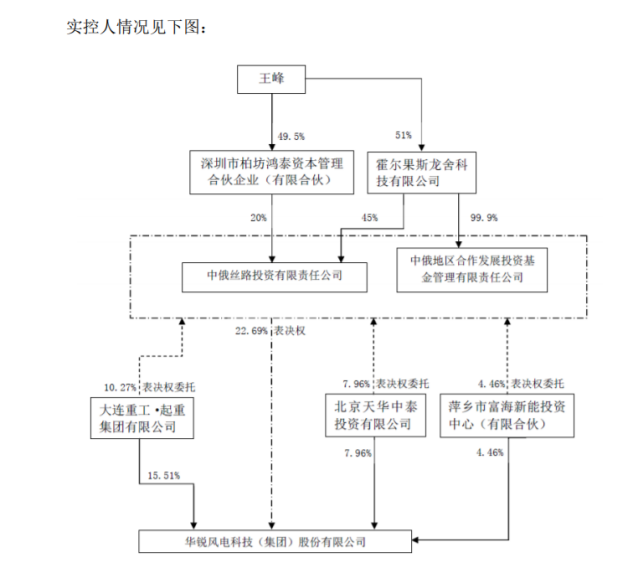 公告显示,2020年3月30日,中俄丝路和中俄发展通过接受表决权委托的方式,可以实际支配华锐风电表决权股份合计1,368,423,800 股,占华锐风电总股本的 22.69 %,王峰成为华锐风电的实际控制人。北京证监局发现中俄丝路和中俄发展未能在上述事实发生之日起3日内编制权益变动报告书,向中国证监会、证券交易所提交书面报告,通知华锐风电,并予公告。