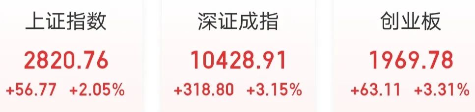 A股三大指数今日集体大涨,其中沪指收盘上涨2.05%,收复2800点整数关口,收报2820.76点;深成指上涨3.15%,收报10428.91点;创业板指上涨3.31%,收报1969.78点。两市合计成交7321亿元,行业板块全线上扬,农牧饲渔、食品饮料、贵金属板块强势领涨。