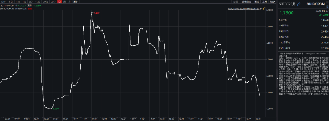 市场关注度较高的3个月期Shibor,目前已经跌至1.73%,创下2009年8月11日以来的最低点。