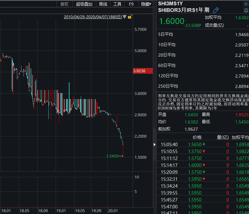与此同时,基于3个月Shibor的一年期人民币利率互换交易中, 3个月Shibor已经下降到1.6%,创下历史低点。