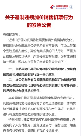 4月8日东方航空通过官方微博发布一则《关于遏制违规加价销售机票行为的紧急公告》。