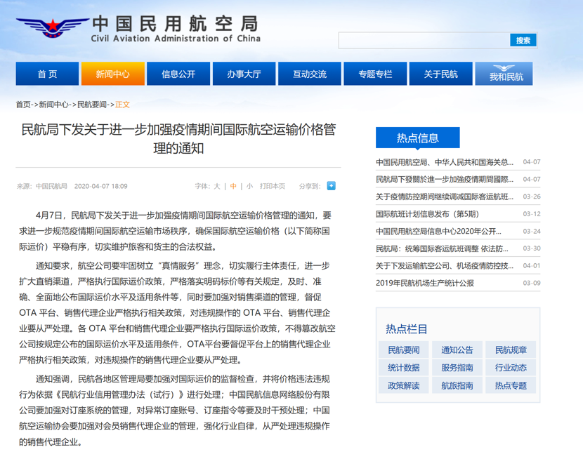 4月7日,民航局官网刚刚发布消息称,民航局下发关于进一步加强疫情期间国际航空运输价格管理的通知,要求进一步规范疫情期间国际航空运输市场秩序,确保国际航空运输价格(以下简称国际运价)平稳有序,切实维护旅客和货主的合法权益。