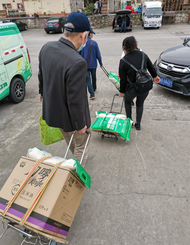 4月6日,在深圳益田社区,一个老人从盒马鲜生提了两袋大米,测量体温的工作人员对他说,退回去一袋吧,吃不完会生虫。老人家身后,另一个老人正从超市往外拎了一袋米。