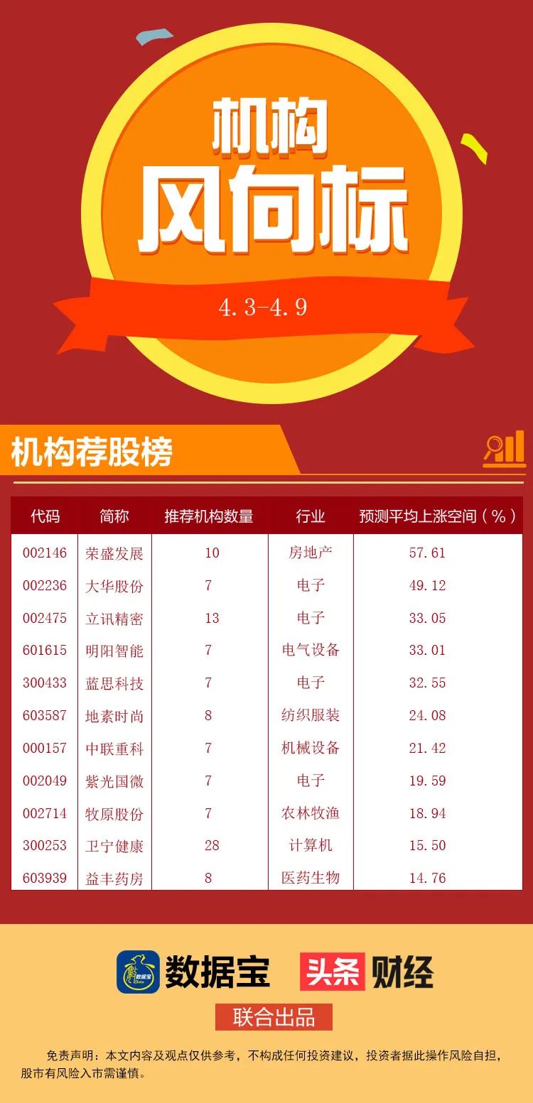 数据宝统计显示,近一周机构买入评级不少于7次、给出目标价不少于3家的个股中,将公布的目标价与最新收盘价相比,荣盛发展、大华股份、立讯精密、明阳智能、蓝思科技、地素时尚和中联重科7股的机构平均预测上涨空间超20%。