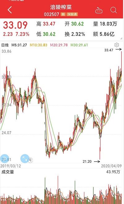 涪陵榨菜又创历史新高了。今日涪陵榨菜小幅低开后持续震荡上扬。截至收盘,该股大涨7.23%,收报33.09元,为近期创出的又一历史新高。除了涪陵榨菜,食品饮料行业可谓牛股成群。以海天味业为首的食品股中,包括洽洽食品、桃李面包等11只股票3月20日以来创出了历史新高。