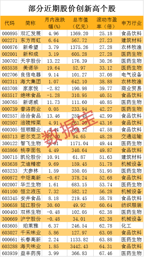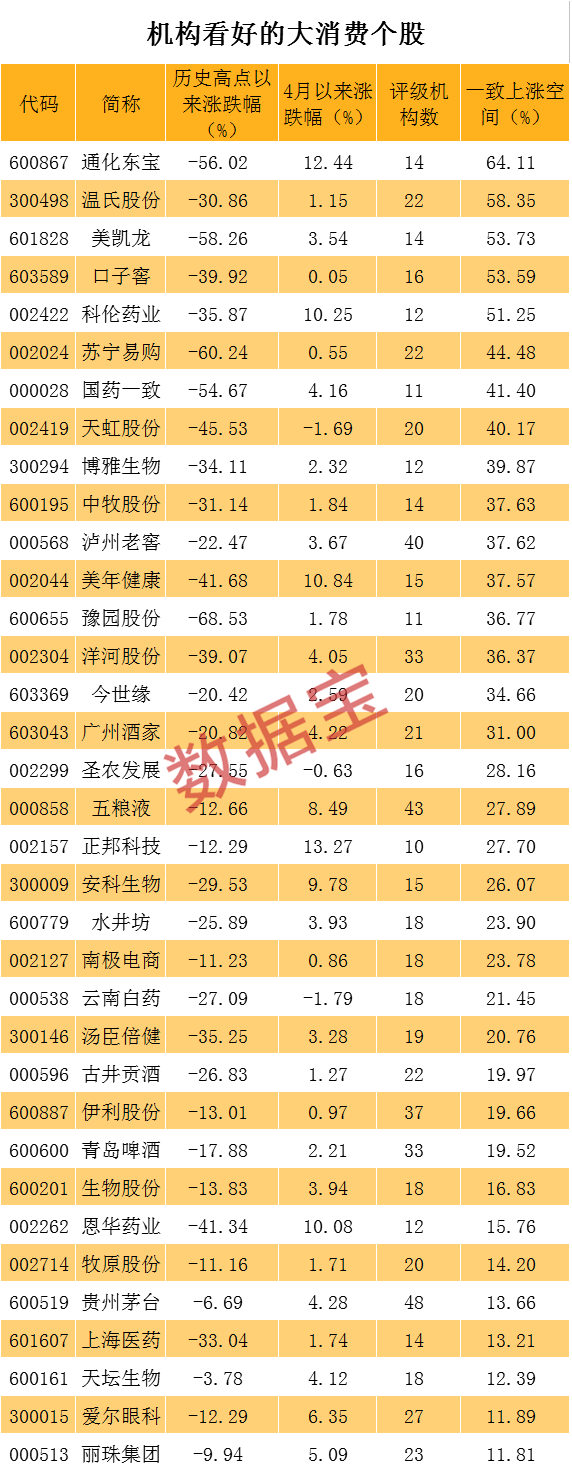数据宝统计显示,隶属于大消费板块、且周期性较弱的食品饮料、医药生物、农林牧渔、商业贸易等4个行业中,剔除上述创新高股及次新股后,有65只股票评级机构数在10家以上且市值超过百亿元。