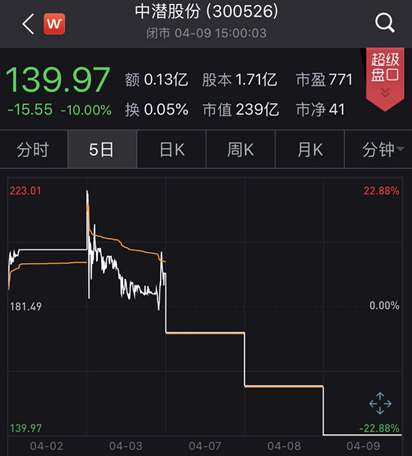 然而 “妖王”宝座还没坐热乎,中潜就下去了。4月3日,中潜股价出现波动,清明节过后,4月7日开盘以来,更是连吃三个停板。4日股价共跌36.04%,最新股价139.97元/股,市值较4月2日缩水了超100亿元。