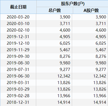 近年来,中潜股份股东数呈明显下降态势,2018年年报股东户数为14914户;2019年中报为12342户;2019年三季报为8276户,2019年年报为4905户,2020年2月10日为4600户。而截至今年3月20日,中潜的股东数仅剩3900户,股东户数高度集中。