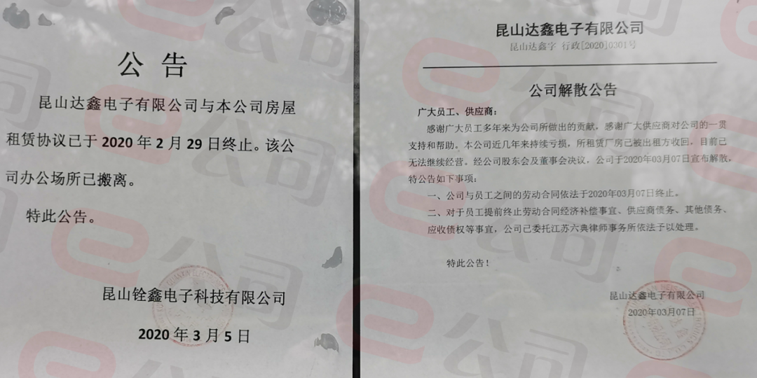 门口保安强调称,“达鑫电子已经搬走了,厂里的设备也都搬走了,我们是房东雇来看厂的。”在保安室的窗户上,贴着一份落款为3月7日的《公司解散公告》。公告中称,“本公司近几年来持续亏损,所租赁厂房已被出租方收回,目前已经无法继续经营。”