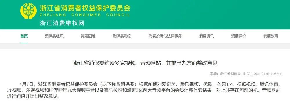4月8日,浙江省消费者权益保护委员会(以下称省消保委)根据前期对爱奇艺、腾讯视频、优酷、芒果TV、搜狐视频、腾讯体育、PP视频、乐视视频和哔哩哔哩九大视频平台以及喜马拉雅和蜻蜓FM两大音频平台的会员消费体验结果,对上述存在问题的视、音频网站进行约谈并提出整改意见。