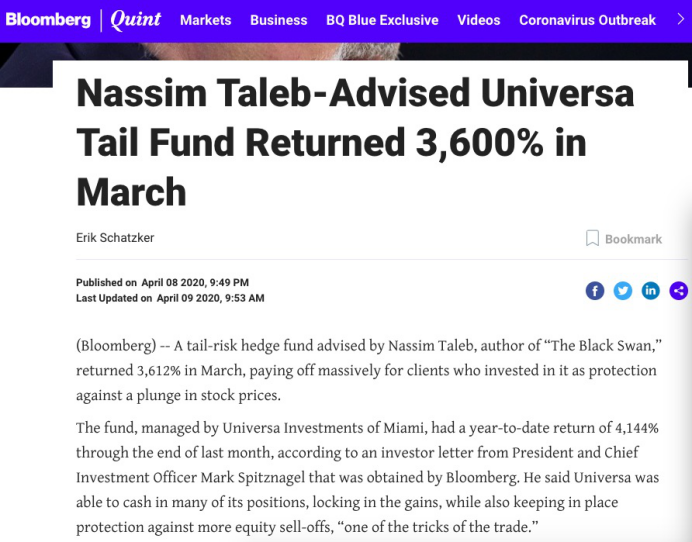 而在这惊心动魄的三月,Universa Investments旗下被称为“黑天鹅基金”的尾部风险策略基金却录得3612%的净回报率,可谓是熔断中的印钞机。