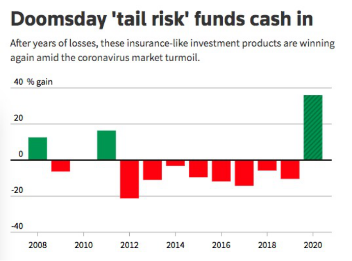 三月下旬,路透社也报道了另一家专注尾部风险管理的基金公司——Saba在市场下跌时的优异表现,3月13日单日,Saba旗下的尾部风险基金获得了175%的收益。