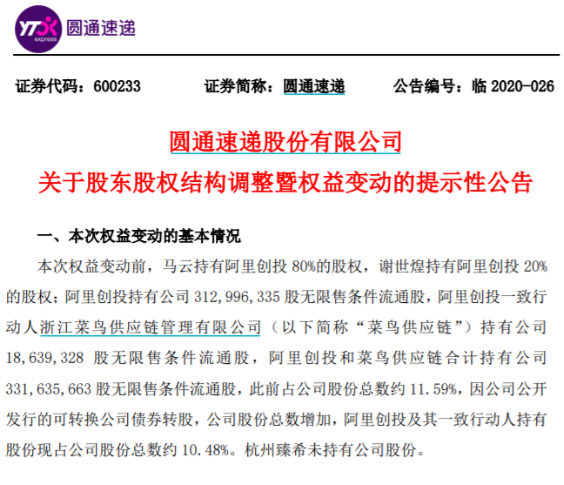 圆通速递公告表示,本次权益变动前阿里创投和菜鸟供应链合计持有圆通速递3.32亿股股份,此前占公司股份总数约11.59%,因公司公开发行的可转换公司债券转股,公司股份总数增加,阿里创投及其一致行动人持有股份现占公司股份总数约10.48%。本次权益变动后,介于杭州臻希持有阿里创投 100%的股权,阿里创投和菜鸟供应链仍为一致行动人,合计持股不变,仍为公司第二大股东。