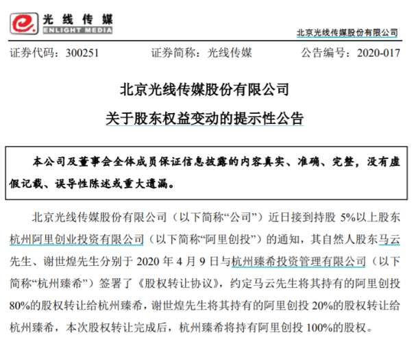 光线传媒公告称本次权益变动后,杭州臻希将持有阿里创投100%的股权,阿里创投持有光线传媒1.9997亿股股份,占股份总数的6.82%。马云将不再持有阿里创投的股权,也不对光线传媒的股份拥有权益。