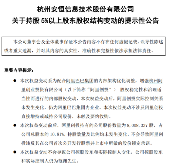 安恒信息公告表示,本次权益变动完成后,杭州臻希将持有阿里创投 100%的股权,阿里创投持有公司 8,008,337 股股份,占公司总股本的 10.81%;马云将不再持有阿里创投的股权,也不拥有安恒信息的权益。