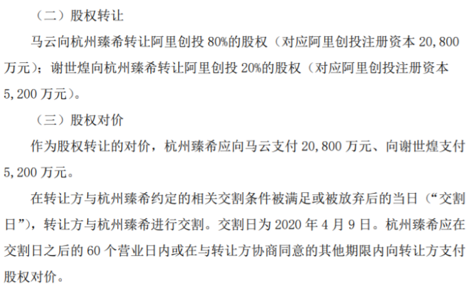 4月9日,马云、谢世煌与杭州臻希签署了《股权转让协议》,约定马云将其持有的阿里创投80%的股权转让给杭州臻希,谢世煌将其持有的阿里创投20%的股权转让给杭州臻希,本次股权转让完成后,杭州臻希将持有阿里创投100%的股权。