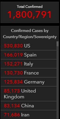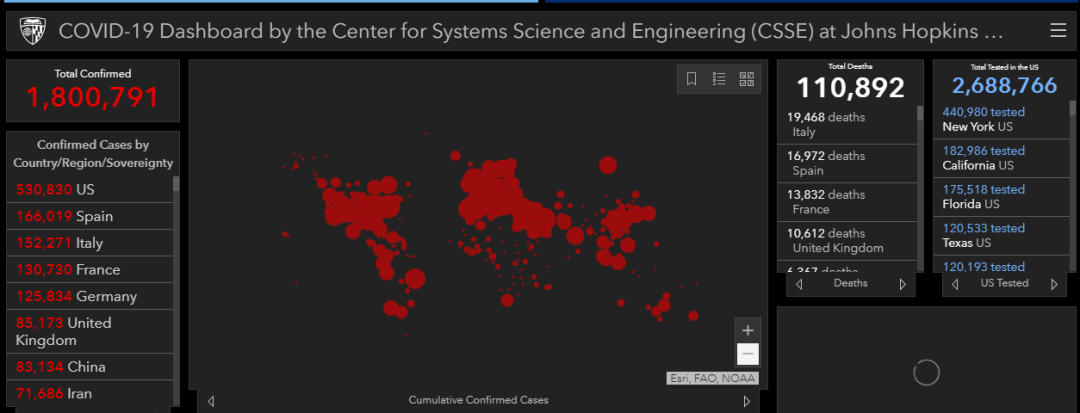 据美国约翰·霍普金斯大学发布的实时统计数据显示,截至北京时间2020年04月12日23:40,全球新冠肺炎累计确诊1800791例,累计死亡110892例,累计确诊国家和地区数185个。其中,美国累计确诊530830例,死亡20646例。西班牙累计确诊166019例,死亡16972例。意大利累计确诊152271例,死亡19468例。法国累计确诊130730例,死亡13851例。德国累计确诊125834例,死亡2886例。