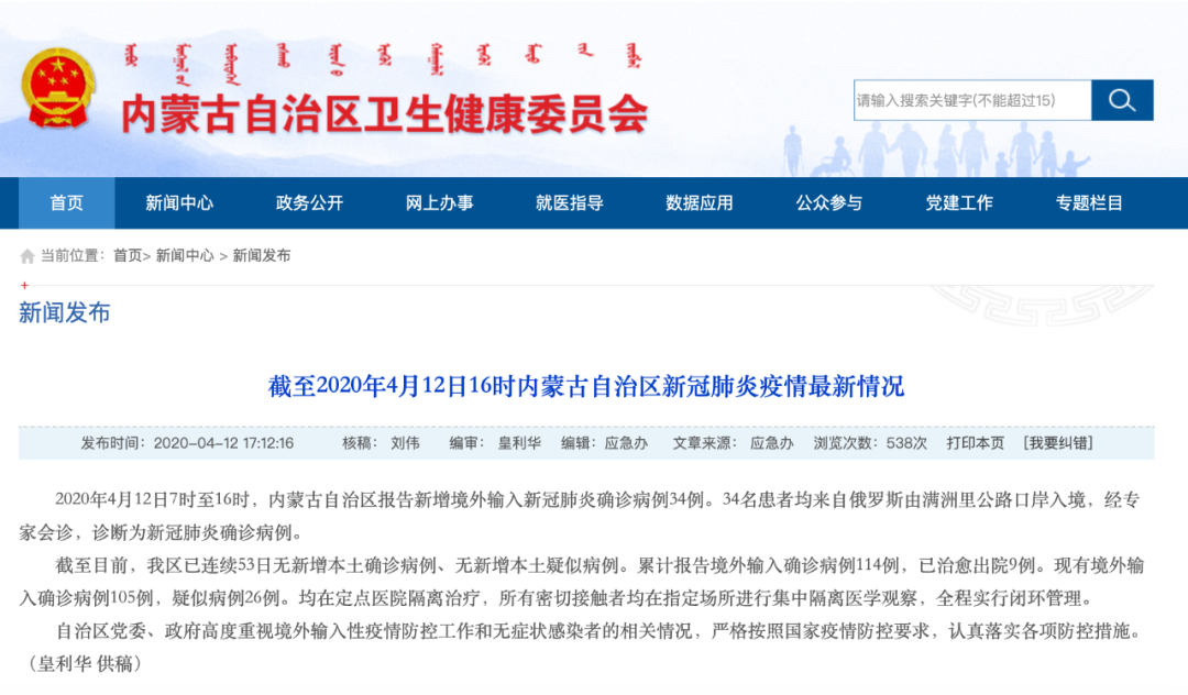 2020年4月12日7时至16时,内蒙古自治区报告新增境外输入新冠肺炎确诊病例34例。34名患者均来自俄罗斯,由满洲里公路口岸入境,经专家会诊,诊断为新冠肺炎确诊病例。