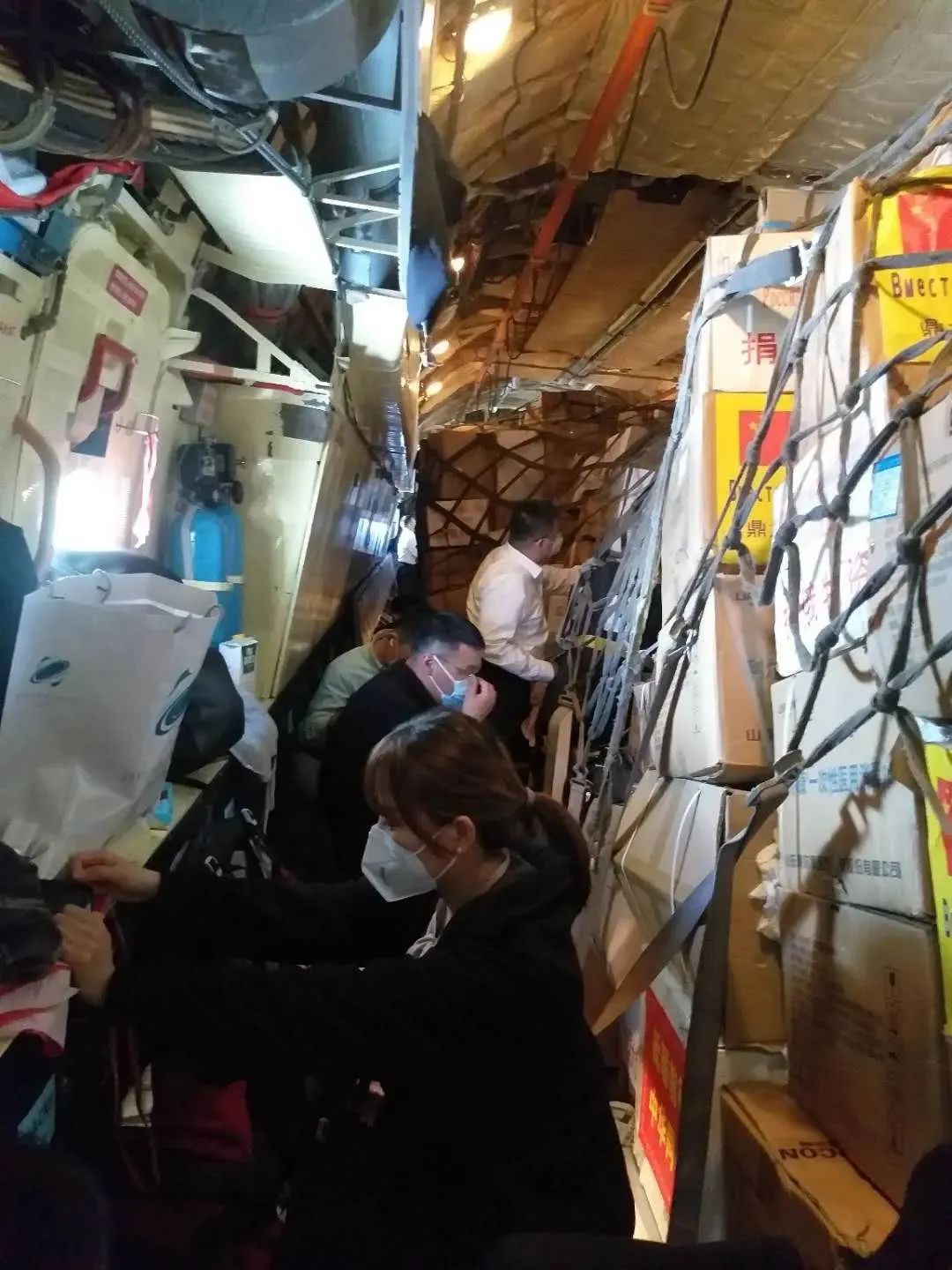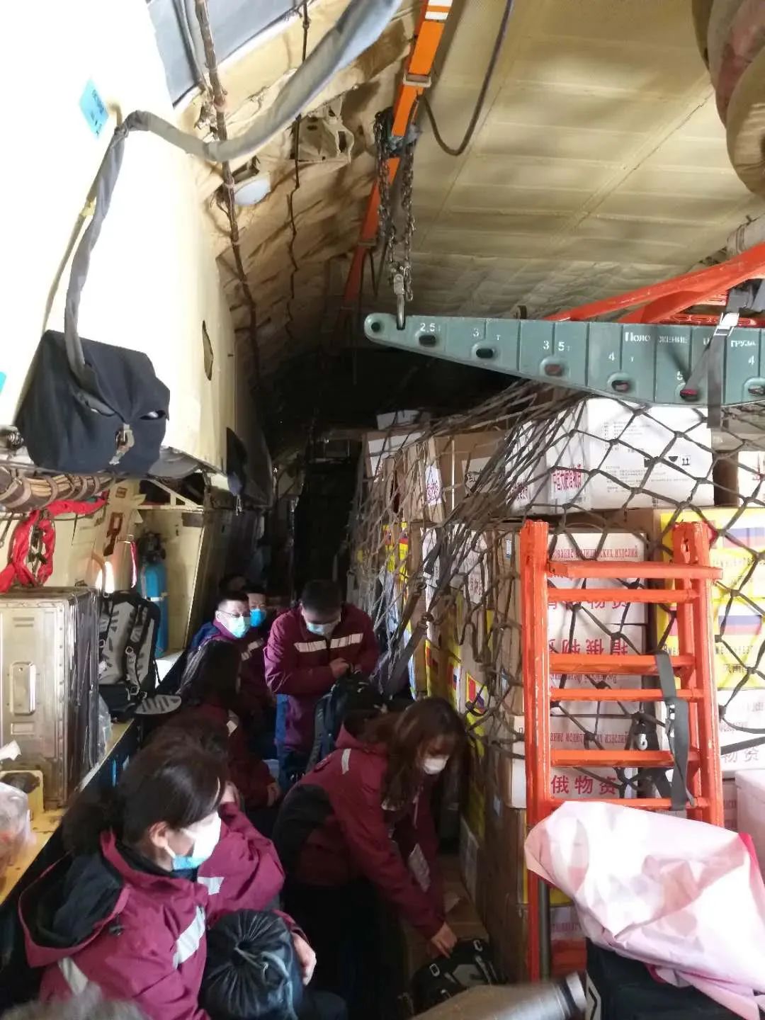 抗疫物资高高堆起,几乎占满了整个机舱,紧靠机舱壁的50厘米宽的铁质座椅上面铺着一层坐垫,座椅和货物之间,是宽度不足50厘米的过道,必须侧身才能通过