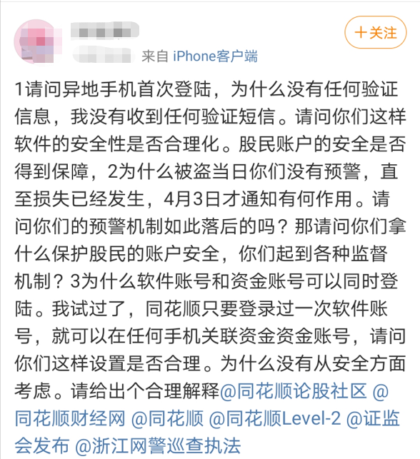 对于受害的投资者来说,其重要异议在于,在账号异地登陆之时,同花顺未通过验证短信提醒。并且,软件账号和资金账号可以同时登陆的问题,也是投资者认为同花顺设置不合理、存在安全隐患之处。