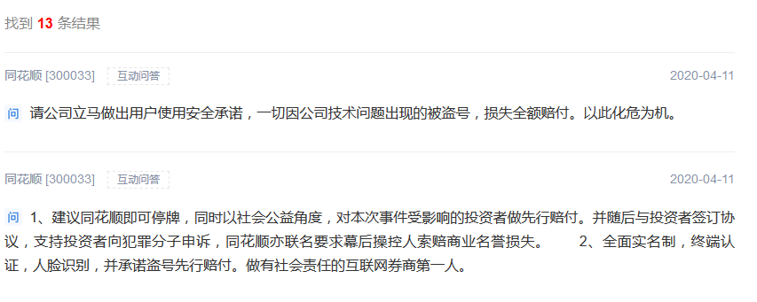 在应对方面,同花顺表示,其建立了安全完善的服务器系统和数据存储保障制度,设立了灾难备份中心,以确保系统和数据的稳定和安全。不过,同花顺也坦言,“在当前网络环境下,任何一个IT系统都可能面临安全问题”。