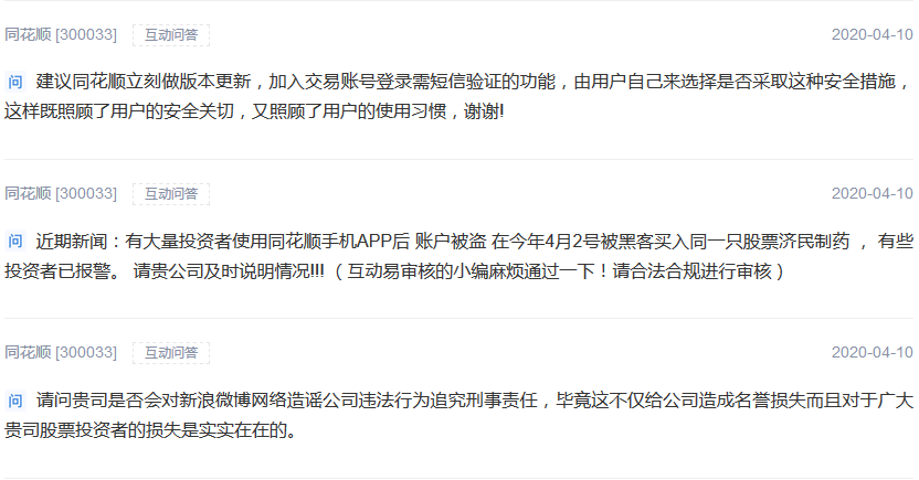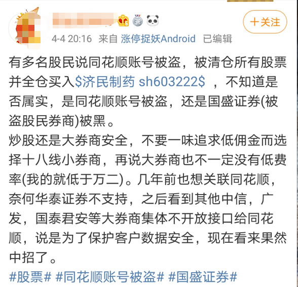 近日,有一些股民反映证券账户被盗用,不仅卖出原有持仓股票,更大量买入次日一字跌停的济民制药。开户券商虽然不同,但使用同花顺软件是投资者的共同点之一,因此投资者们也将矛头对准了同花顺。此后,同花顺也对此作出声明,称“网络传言与事实不符”, 呼吁用户加强账户安全防范意识。